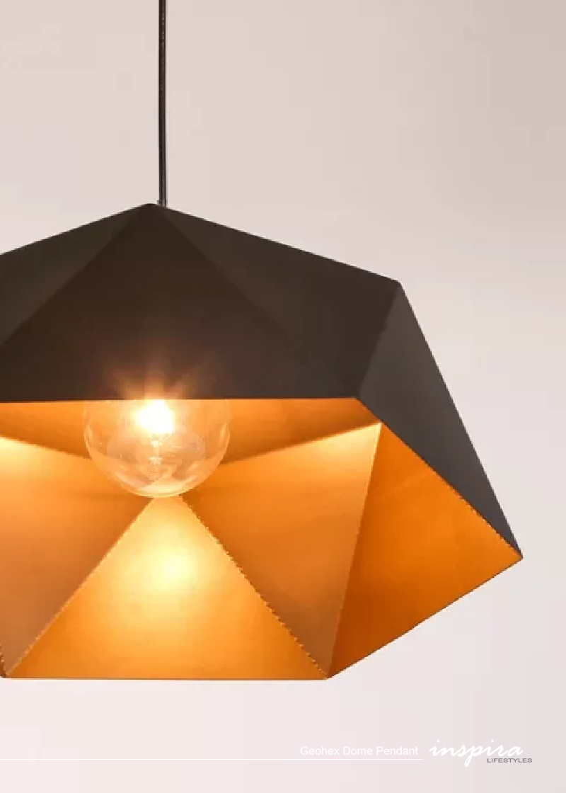 Designed to cast warm, focused light downward, the copper interior enhances atmosphere while keeping illumination practical and intentional. This makes the Geohex Dome Pendant especially well suited above dining tables, kitchen islands, office meeting tables, and bar counters — spaces where light needs to feel both inviting and functional. The angular silhouette adds structure overhead, anchoring seating and surfaces below.